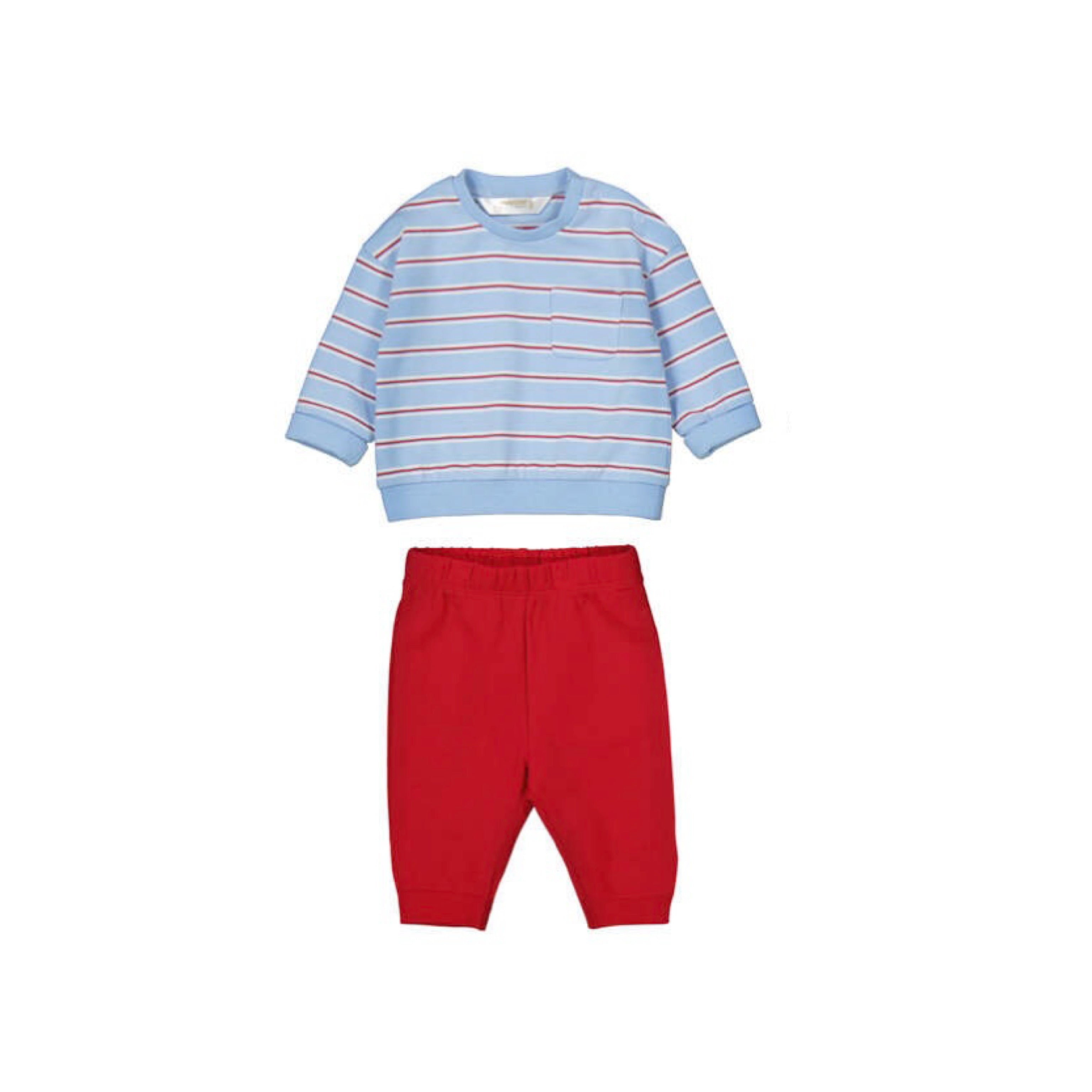 This adorable jogger set is a must have for your little guy. Set includes a stripe long sleeve crewneck that is super lightweight but a definite cute look. The top features a tiny pocket on the front. The joggers are a coordinating red with an elastic waist and faux drawstring. Makes a great gift too!