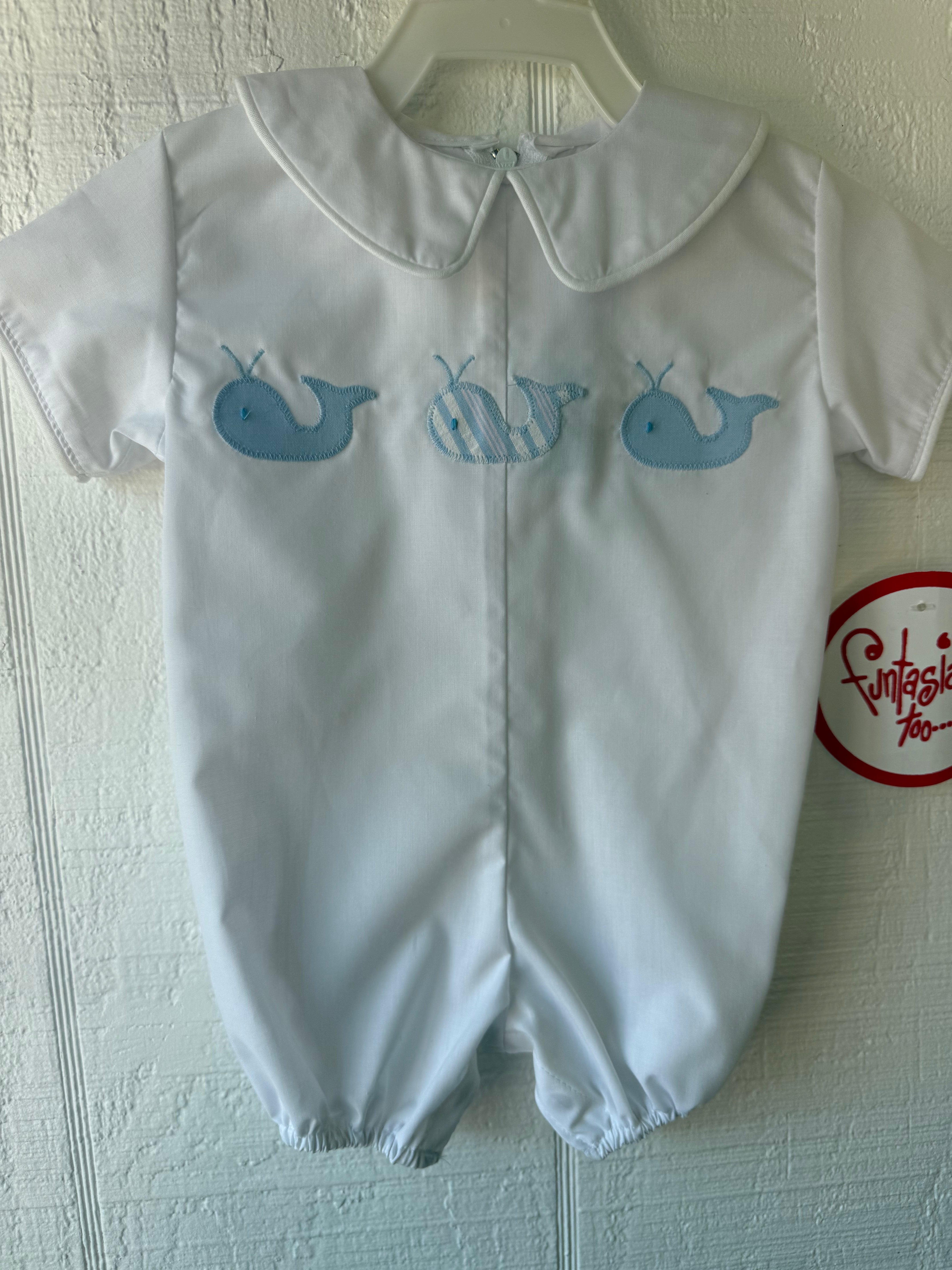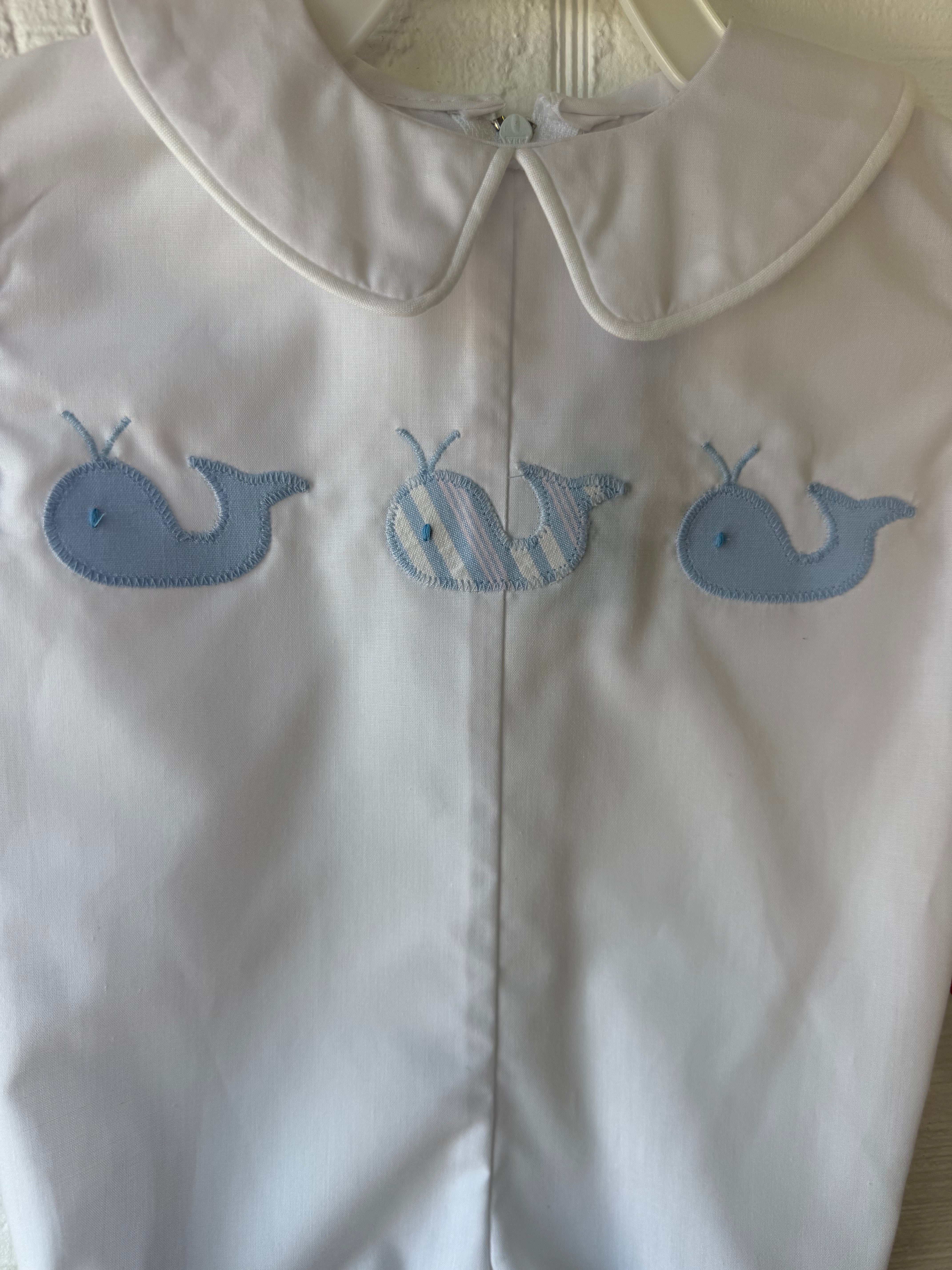 Adorable white bubbles a summer essential. Great for a special occasion too! White broadcloth fabric and blue fabric appliquéd whales are the perfect combination. Bubble features a Peter Pan collar, snaps in stride and a zipper back closure.