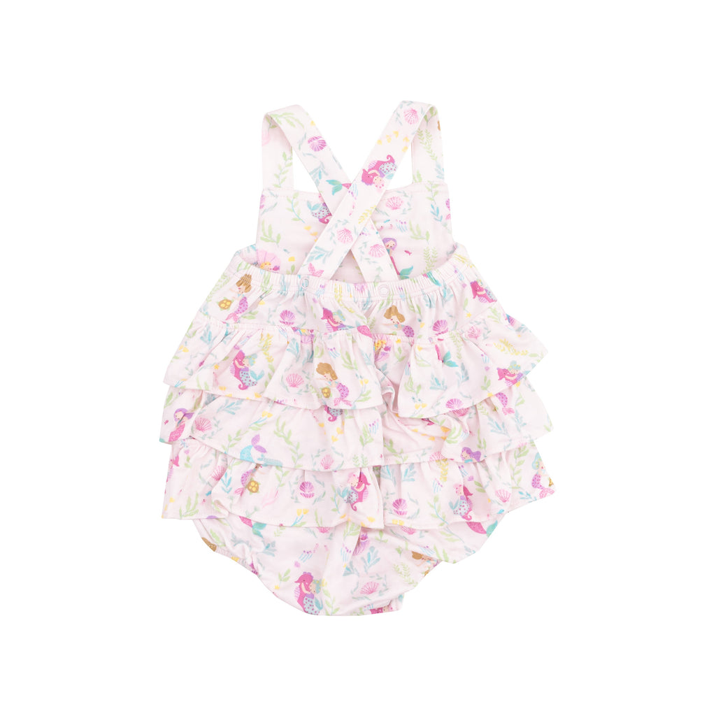 Cute mermaid print on the popular body style is a great piece for summer. Sunsuit features ruffles on back and cross cross straps.