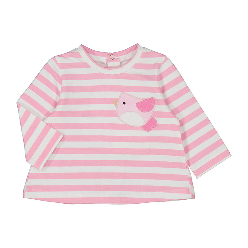 Adorable pink stripe tee features long sleeves and a cute bird appliqué. Great to pair with jeans or sweats for a complete look!