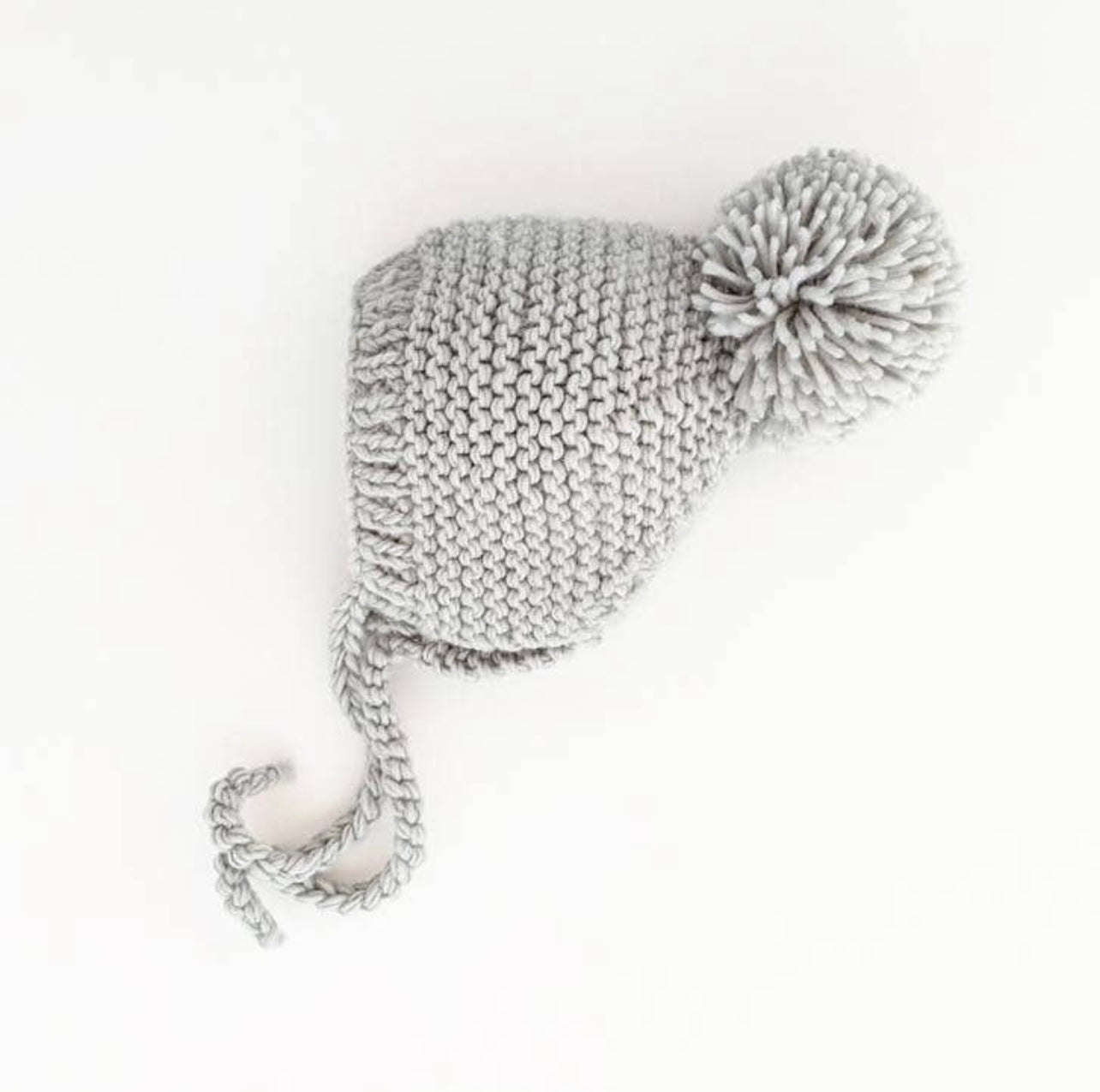 Beautiful knit bonnet is a photo worthy hat. Great for newborn pics and those cold days to keep baby warm. Topped with a furry pom! Fits newborn.