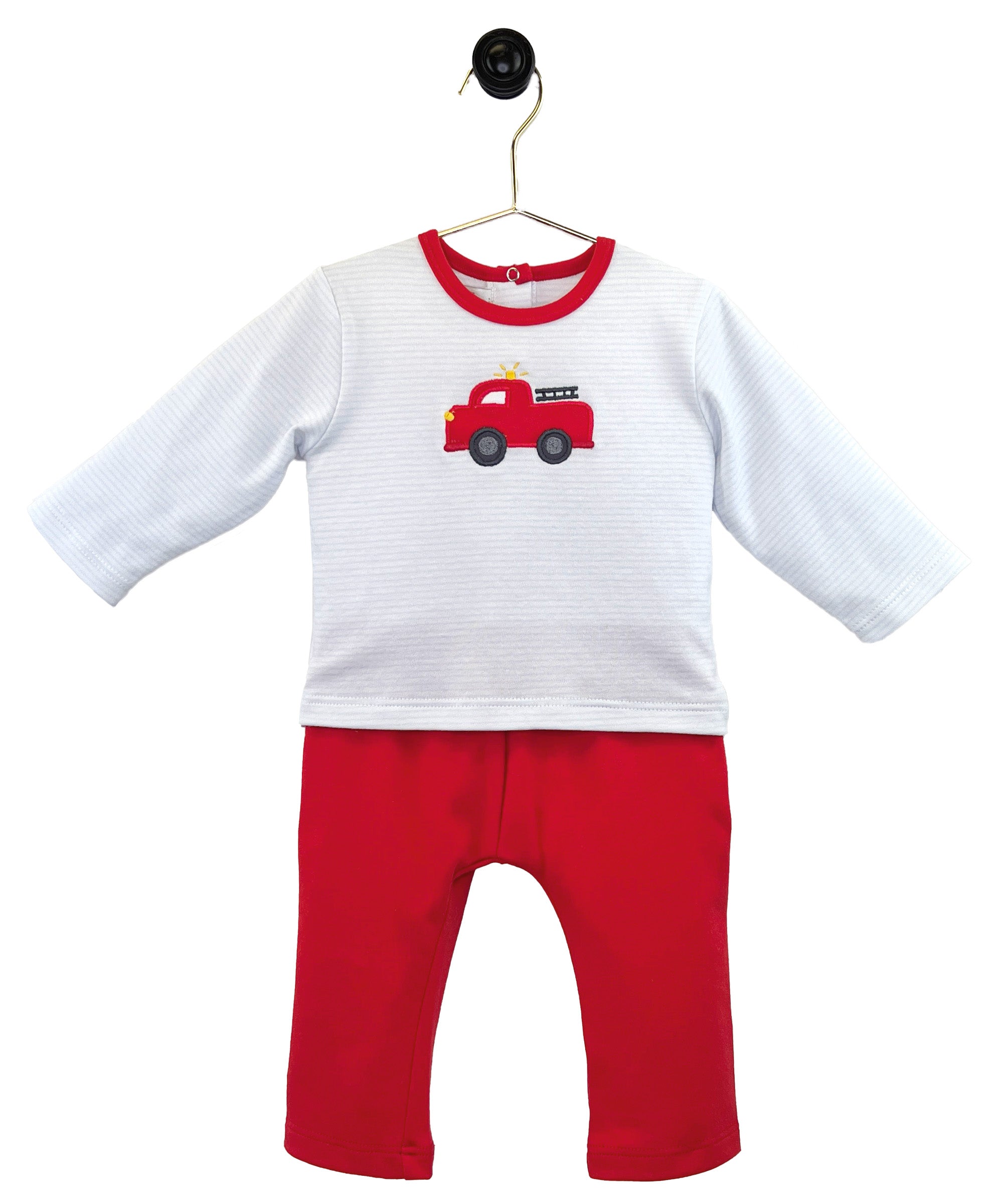 Pale blue stripe top features firetruck embroidery with red trim along with coordinating red pants.