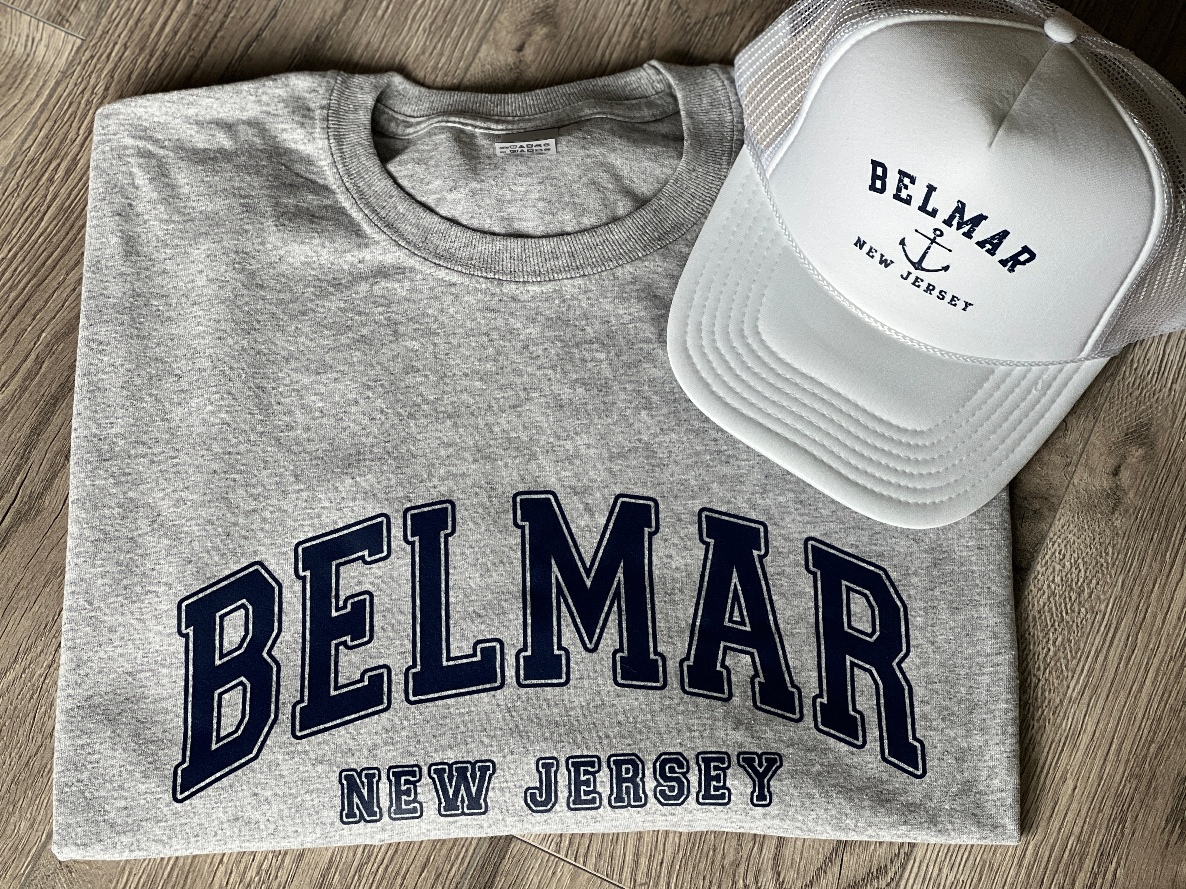 Grey short sleeve tee features our Belmar logo print. Pair with trucker hat for a fun jersey shore look. Adult size. Hat sold separately.
